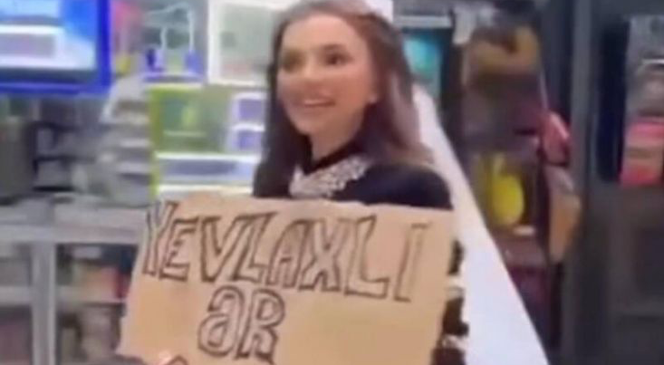KONKRET.az xəbər verir ki, diqqətçəkən libas geyinən gənc qız “Yevlaxlı ər axtarıram” yazılı tablo ilə şəhərin mərkəzində gəzib.