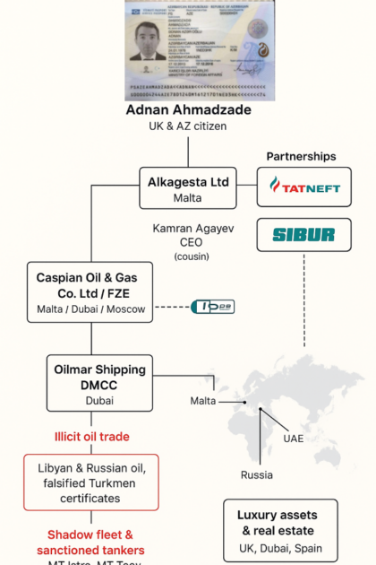 Məlumata görə, Adnan Əhmədzadənin əmisi oğlu Kamran Ağayevə məxsus olan Alkagesta Maltanın ən böyük neft-bunker şirkətidir və Maltanın Birzebbuğa neft terminalından istifadə edərək rus neftini Rusiyanın “kölgə donanması” vasitəsilə daşıyır. Həmçinin BMT-nin embarqo qoyduğu Liviyadan neft ticarəti ilə məşğul olur.