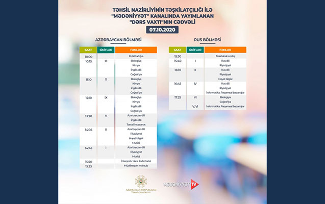 “Mədəniyyət”, “ARB Günəş” telekanalları və “Təhsil” televiziyasının “Facebook” səhifəsində yayımlanan “Dərs vaxtı” proqramının oktyabrın 7-si üçün nəzərdə tutulan cədvəli açıqlanıb.
