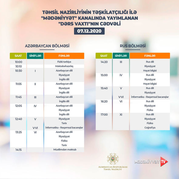 Təhsil Nazirliyi dərs cədvəlinə diqqət yetirməyi, mövzuları “Dərs vaxtı”nda öyrənməyi tövsiyə edir.