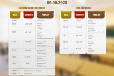 “Dərs vaxtı”nın sabaha olan cədvəli - FOTO08 İyun, 2020 - 15:35448Təhsil Nazirliyinin təşkilatçılığı ilə “Mədəniyyət” və “ARB Günəş” kanallarında yayımlanan “Dərs vaxtı”nın iyunun 9-na olan cədvəli açıqlanıb. KONKRET.az cədvəli təqdim edir: Şikayətinizi və şahidi olduğunuz hadisəni çəkib bizə göndərin!