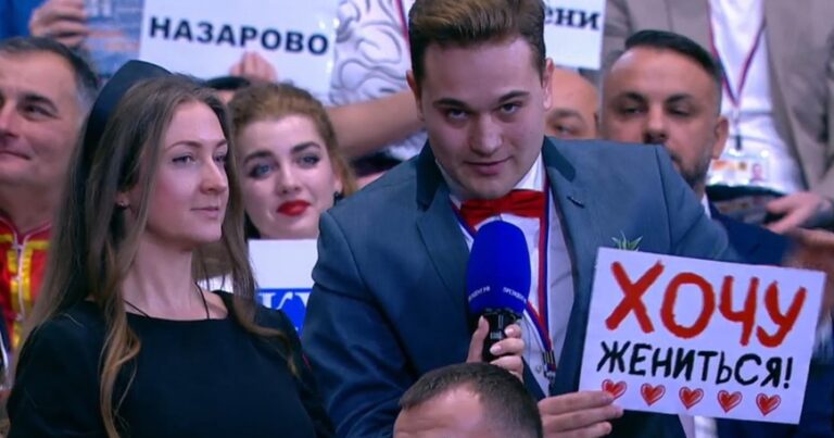 22 yaşlı jurnalistə söz verildikdə isə o, canlı yayımda sevdiyi xanıma evlilik təklif edib və Rusiya liderini toyuna dəvət edib: “Plakatda yazılan doğrudur. Bilirəm ki, o, hazırda məni izləyir. Mənə ərə gəl. Vladimir Vladimiroviç, sizi toyumuzda görməkdən şad olarıq”.