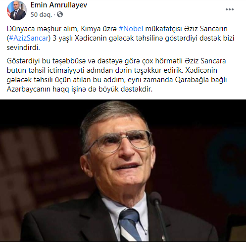 “Dünyaca məşhur alim, Kimya üzrə Nobel mükafatçısı Əziz Sancarın 3 yaşlı Xədicənin gələcək təhsilinə göstərdiyi dəstək bizi sevindirdi. Göstərdiyi bu təşəbbüsə və dəstəyə görə çox hörmətli Əziz Sancara bütün təhsil ictimaiyyəti adından dərin təşəkkür edirik. Xədicənin gələcək təhsili üçün atılan bu addım, eyni zamanda Qarabağla bağlı Azərbaycanın haqq işinə də böyük dəstəkdir”.