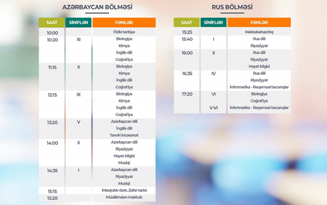 KONKRET.az xəbər verir ki, Təhsil Nazirliyi dərs cədvəlinə diqqət etməyi, mövzuları “Dərs vaxtı”nda öyrənməyi tövsiyə edir.