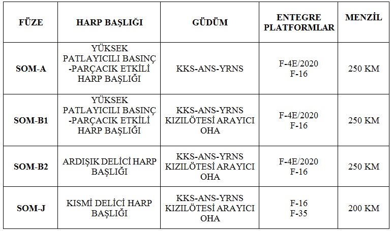 Qeyd edək ki, SOM qardaş ölkənin istehsal etdiyi yüksək standartlara uyğun olan silahlardan biridir. Raket 500 kilometr məsafədə yerləşən, güclü mühafizə olunan quru və dəniz hədəflərini son dərəcə dəqiqliklə vura bilir. Raketin əsas xüsusiyyəti çətin iqlim şəraitində dözümlü, yüksək partlayıcı təsiri malik olmasıdır.